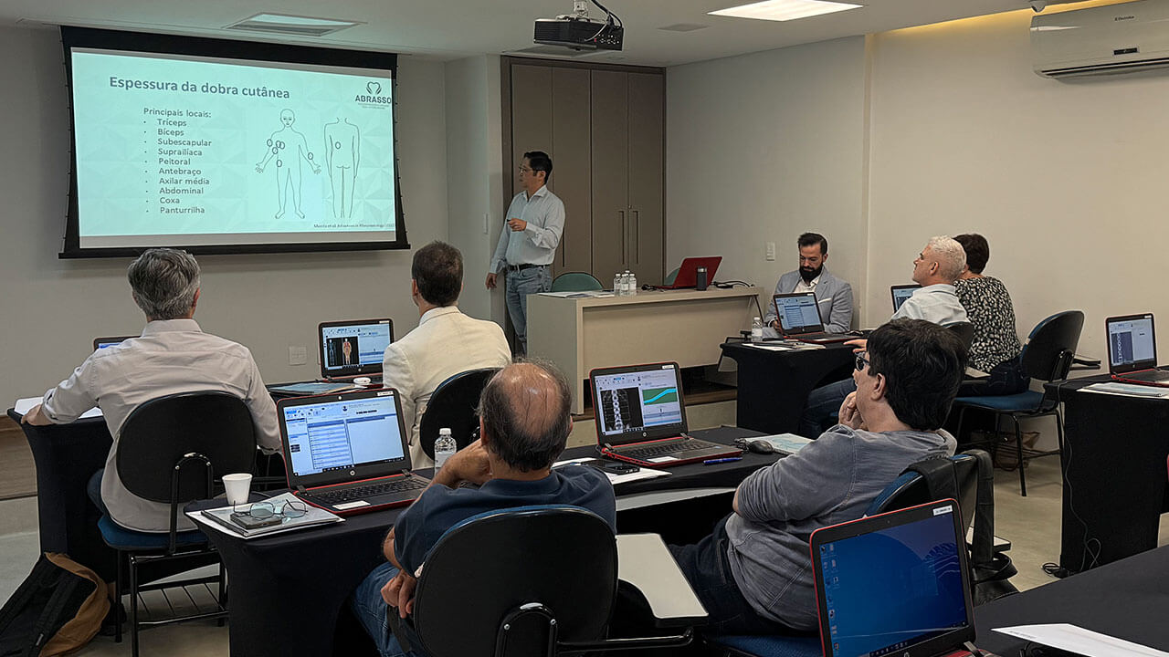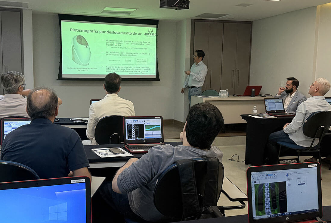 Já no período da tarde, o curso de Body Composition teve como foco a aplicação da densitometria na avaliação da composição corporal, com demonstrações práticas em diferentes equipamentos, discussão de casos clínicos e análise comparativa de exames, com base em modelos de laudo da ABRASSO.